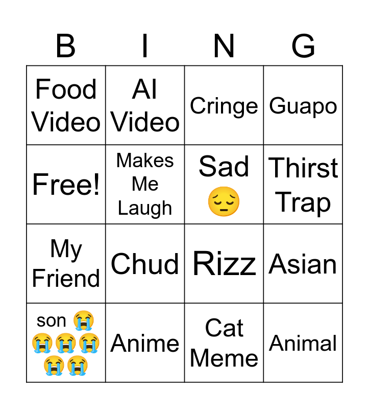 This bingo card has 16 words: Anime, Asian, Cringe, Food Video, My Friend, AI Video, Rizz, Cat Meme, Free!, Makes Me Laugh, son 😭 😭😭😭😭😭, Guapo, Chud, Thirst Trap, Sad😔 and Animal.