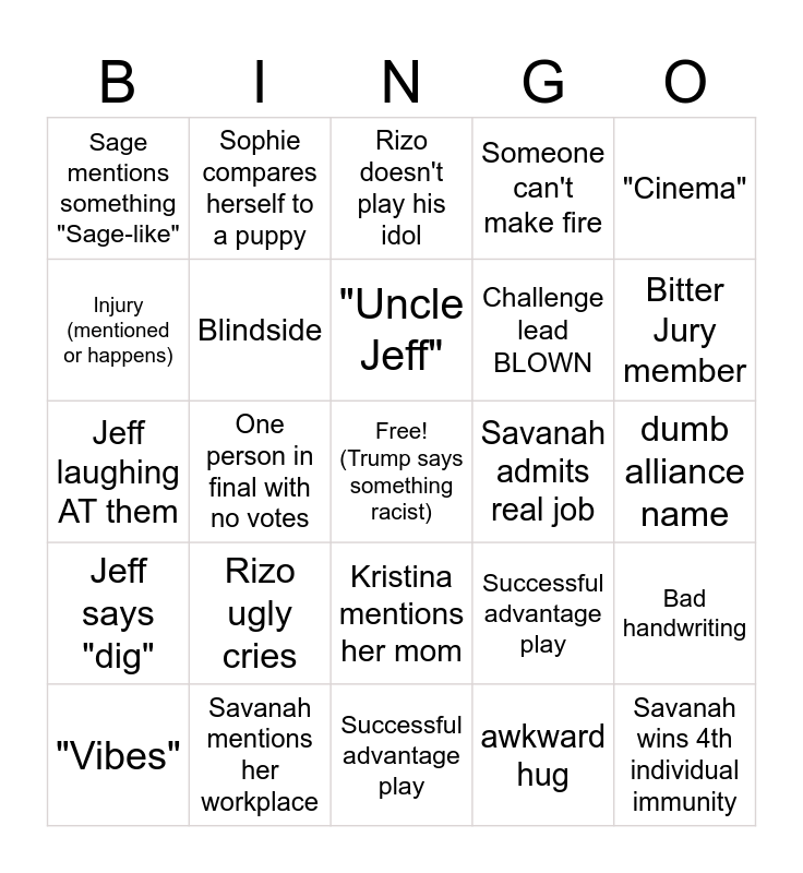 This bingo card has a free space and 24 words: Rizo ugly cries, Savanah mentions her workplace, "Uncle Jeff", "Vibes", "Cinema", Sage mentions something "Sage-like", Injury (mentioned or happens), Sophie compares herself to a puppy, Savanah admits real job, Kristina mentions her mom, Challenge lead BLOWN, Jeff laughing AT them, Successful advantage play, Bad handwriting, Blindside, awkward hug, dumb alliance name, Rizo doesn't play his idol, Bitter Jury member, One person in final with no votes, Savanah wins 4th individual immunity, Jeff says "dig", Someone can't make fire and Successful advantage play.