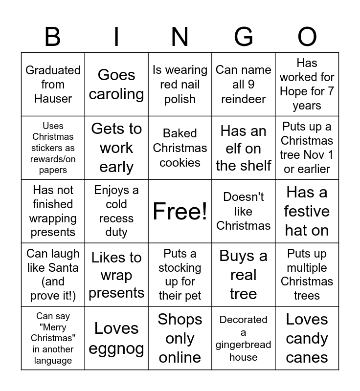 This bingo card has a free space and 24 words: Likes to wrap presents, Loves eggnog, Baked Christmas cookies, Can say "Merry Christmas" in another language, Has worked for Hope for 7 years, Graduated from Hauser, Uses Christmas stickers as rewards/on papers, Goes caroling, Doesn't like Christmas, Puts a stocking up for their pet, Has an elf on the shelf, Has not finished wrapping presents, Buys a real tree, Puts up multiple Christmas trees, Gets to work early, Decorated a gingerbread house, Has a festive hat on, Is wearing red nail polish, Puts up a Christmas tree Nov 1 or earlier, Enjoys a cold recess duty, Loves candy canes, Can laugh like Santa (and prove it!), Can name all 9 reindeer and Shops only online.
