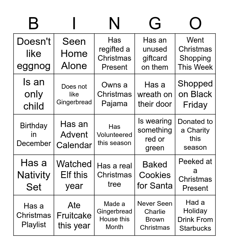 This bingo card has 41 words: Wearing an Ugly Christmas Sweater, Birthday in December, Wrote a Letter to Santa, Does not like Gingerbread, Ate Fruitcake this year, Has a real Christmas tree, Owns a Christmas Pajama, Has been caroling before, Went Christmas Shopping This Week, Has a Nativity Set, Has an Advent Calendar, Has an unused giftcard on them, Has Volunteered this season, Donated to a Charity this season, Is wearing something red or green, Watched Elf this year, Wearing a Santa Hat, Doesn't like eggnog, Never Been Ice Skating, Has regifted a Christmas Present, Peeked at a Christmas Present, Had a Holiday Drink From Starbucks, Made a Gingerbread House this Month, Has a wreath on their door, Owns a Snow Globe, Decorated before Thanksgiving, Never Seen Charlie Brown Christmas, Someone you didn't come with, Shopped on Black Friday, Knows all the Reindeer's names, Has a stocking for their pet, Seen Home Alone, Has a Christmas Playlist, Wearing Christmas socks, Baked Cookies for Santa, Is an only child, Likes to Drive Around Looking at Christmas Lights, Has gone to the Snow This Year, Loves Eggnog, Has gotten a bike for Chrismas before and Hangs up stockings.