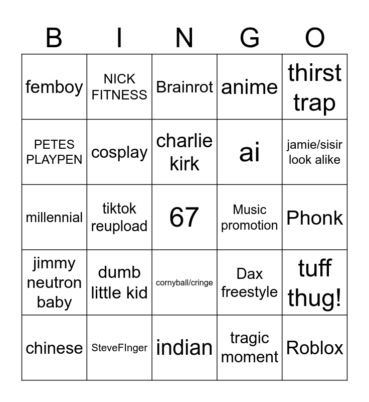This bingo card has 25 words: dumb little kid, indian, charlie kirk, chinese, thirst trap, femboy, PETES PLAYPEN, NICK FITNESS, Music promotion, cornyball/cringe, ai, millennial, Dax freestyle, tuff thug!, cosplay, Roblox, Phonk, Brainrot, jamie/sisir look alike, tiktok reupload, 67, SteveFInger, jimmy neutron baby, anime and tragic moment.