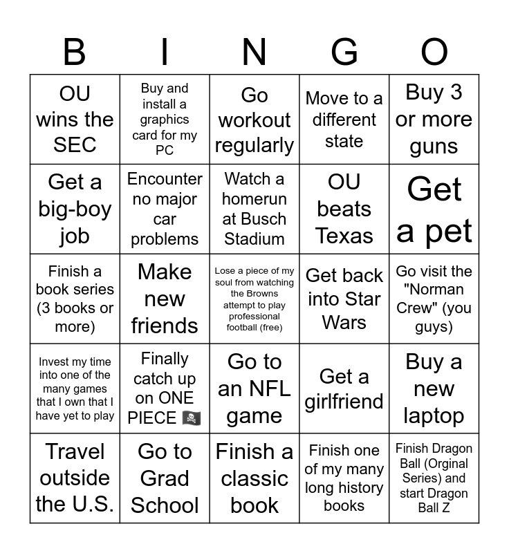 This bingo card has a free space and 24 words: Finally catch up on ONE PIECE 🏴☠️, Go to Grad School, Watch a homerun at Busch Stadium, Travel outside the U.S., Buy 3 or more guns, OU wins the SEC, Get a big-boy job, Buy and install a graphics card for my PC, Get back into Star Wars, Go to an NFL game, OU beats Texas, Finish a book series (3 books or more), Get a girlfriend, Buy a new laptop, Encounter no major car problems, Finish one of my many long history books, Go visit the "Norman Crew" (you guys), Go workout regularly, Get a pet, Make new friends, Finish Dragon Ball (Orginal Series) and start Dragon Ball Z, Invest my time into one of the many games that I own that I have yet to play, Move to a different state and Finish a classic book.