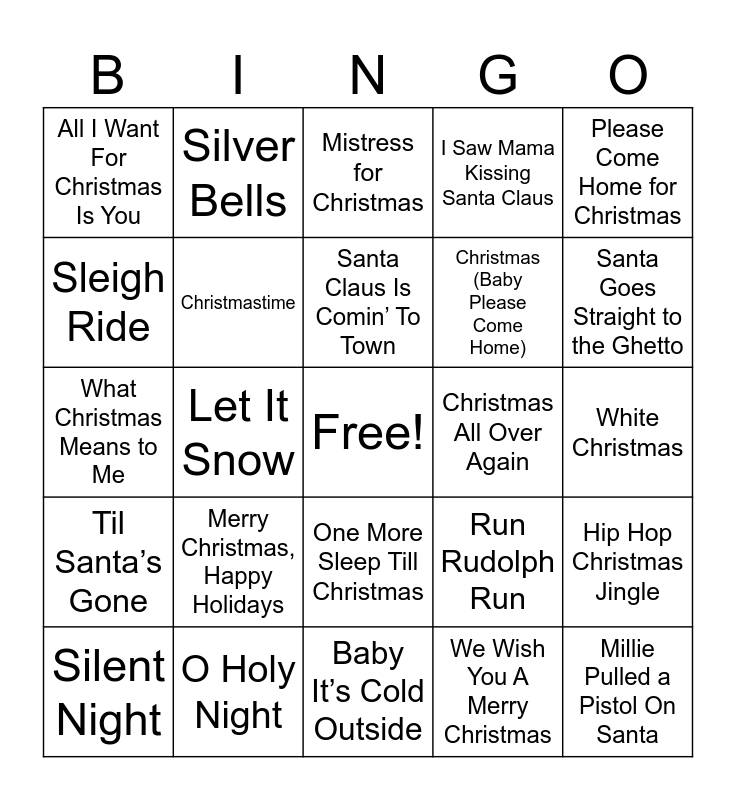 This bingo card has a free space and 24 words: Merry Christmas, Happy Holidays, O Holy Night, Santa Claus Is Comin’ To Town, Silent Night, Please Come Home for Christmas, All I Want For Christmas Is You, Sleigh Ride, Silver Bells, Christmas All Over Again, One More Sleep Till Christmas, Christmas (Baby Please Come Home), What Christmas Means to Me, Run Rudolph Run, Hip Hop Christmas Jingle, Christmastime, We Wish You A Merry Christmas, White Christmas, Mistress for Christmas, Santa Goes Straight to the Ghetto, Let It Snow, Millie Pulled a Pistol On Santa, Til Santa’s Gone, I Saw Mama Kissing Santa Claus and Baby It’s Cold Outside.