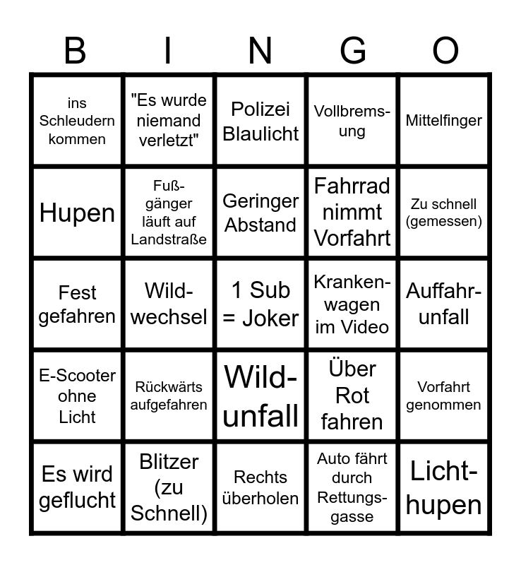 This bingo card has a free space and 24 words: Rückwärts aufgefahren, Blitzer (zu Schnell), Geringer Abstand, Es wird geflucht, Mittelfinger, ins Schleudern kommen, Hupen, "Es wurde niemand verletzt", Kranken-wagen im Video, Wild-unfall, Fahrrad nimmt Vorfahrt, Fest gefahren, Über Rot fahren, Vorfahrt genommen, Fuß-gänger läuft auf Landstraße, Auto fährt durch Rettungs-gasse, Auffahr-unfall, Polizei Blaulicht, Zu schnell (gemessen), Wild-wechsel, Licht-hupen, E-Scooter ohne Licht, Vollbrems-ung and Rechts überholen.