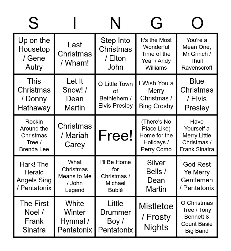 This bingo card has a free space and 75 words: Christmas / Sleighbelle, Little Saint Nick / The Beach Boys, Step Into Christmas / Elton John, White Christmas / Bing Crosby, Rudolph the Red-Nosed Reindeer / Burl Ives, Jingle Bells / Frank Sinatra, O Holy Night / Celine Dion, Do You Hear What I Hear? / Bing Crosby, Baby It's Cold Outside / Idina Menzel & Michael Bublé, Winter Wonderland / Bing Crosby, I Saw Mommy Kissing Santa Claus / Jackson 5, Run Rudolph Run / Chuck Berry, O Little Town of Bethlehem / Elvis Presley, This Christmas / Donny Hathaway, Joy to the World / Nat King Cole, Christmas / Mariah Carey, White Christmas / The Drifters, O Christmas Tree / Tony Bennett & Count Basie Big Band, Carol of the Bells / John Williams, You're a Mean One, Mr.Grinch / Thurl Ravenscroft, Jingle Bell Rock / Bobby Helms, Rockin Around the Christmas Tree / Brenda Lee, Let It Snow! / Dean Martin, Last Christmas / Wham!, It's the Most Wonderful Time of the Year / Andy Williams, Wonderful Christmastime / Paul McCartney, It's Beginning to Look a Lot Like Christmas / Perry Como, Sleigh Ride / The Ronettes, A Holly Jolly Christmas / Burl Ives, Christmas (Baby Please Come Home) / Darlene Love, Happy Xmas (War Is Over) / John Lennon, Here Comes Santa Claus / Gene Autry, All I Want for Christmas Is You / Daniel & The Holly Jollies, Silver Bells / Dean Martin, Blue Christmas / Elvis Presley, I Wish You a Merry Christmas / Bing Crosby, Feliz Navidad / Jose Feliciano, Santa Claus Is Coming to Town / Bruce Springsteen, Have Yourself a Merry Little Christmas / Frank Sinatra, Mistletoe / Frosty Nights, Please Come Home for Christmas / Eagles, Mele Kalikimaka / Bing Crosby, Mistletoe and Holly / Frank Sinatra, Twelve Days of Christmas / Bing Crosby, Where Are You Christmas / Faith Hill, Believe / Josh Groban, The First Noel / Frank Sinatra, Up on the Housetop / Gene Autry, I Want a Hippopotamus for Christmas / Gayla Peevey, Mary Did You Know / Pentatonix, It's Beginning to Look Like Christmas / The Humbugs, I'll Be Home for Christmas / Michael Bublé, Snowman / Sia, Happy Holiday / Andy Williams, Underneath the Tree / Kelly Clarkson, You Make It Feel Like Christmas / Gwen Stefani & Blake Shelton, Silent Night / Dean Snowfield, Hallelujah / Pentatonix, Santa Tell Me / Ariana Grande, The Little Drummer Boy / Bing Crosby, What Christmas Means to Me / John Legend, Linus and Lucy / Vince Guaraldi Trio, All I Want for Christmas (Is My Two Front Teeth) / Nat King Cole Trio, Merry Christmas, Happy Holidays / *NSYNC, Mistletoe / Justin Bieber, (There's No Place Like) Home for the Holidays / Perry Como, Frosty the Snowman / Dean Snowfield, My Only Wish (This Year) / Britney Spears, O Come, All Ye Faithful / Pentatonix, God Rest Ye Merry Gentlemen / Pentatonix, Hark! The Herald Angels Sing / Pentatonix, White Winter Hymnal / Pentatonix, Carol of the Bells / Pentatonix, Little Drummer Boy / Pentatonix and We Need a Little Christmas / Pentatonix.