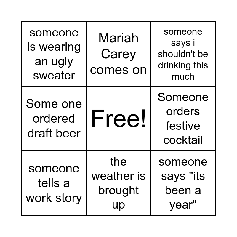 This bingo card has a free space and 8 words: Some one ordered draft beer, Mariah Carey comes on, Someone orders festive cocktail, someone tells a work story, someone says i shouldn't be drinking this much, someone is wearing an ugly sweater, the weather is brought up and someone says "its been a year".