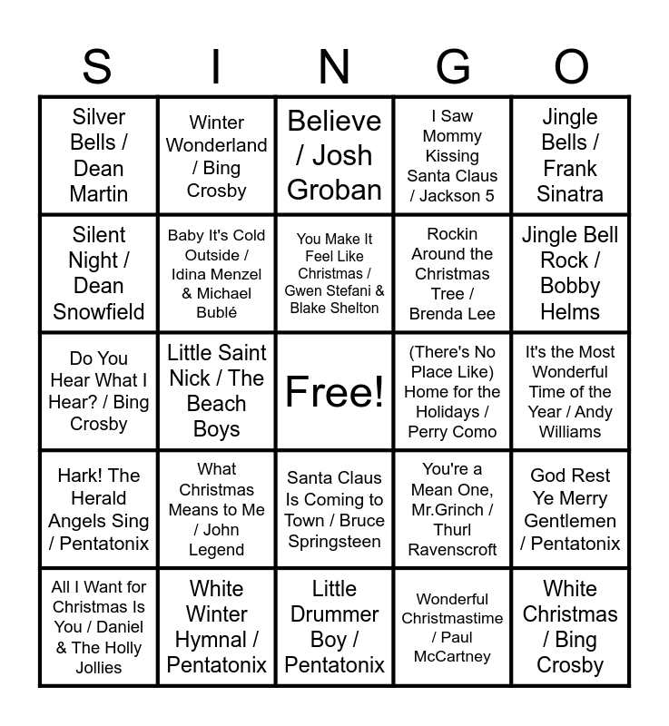 This bingo card has a free space and 75 words: Twelve Days of Christmas / Bing Crosby, Where Are You Christmas / Faith Hill, Believe / Josh Groban, The First Noel / Frank Sinatra, Up on the Housetop / Gene Autry, I Want a Hippopotamus for Christmas / Gayla Peevey, Mary Did You Know / Pentatonix, It's Beginning to Look Like Christmas / The Humbugs, I'll Be Home for Christmas / Michael Bublé, Snowman / Sia, Happy Holiday / Andy Williams, Underneath the Tree / Kelly Clarkson, You Make It Feel Like Christmas / Gwen Stefani & Blake Shelton, Silent Night / Dean Snowfield, Christmas / Sleighbelle, Little Saint Nick / The Beach Boys, Step Into Christmas / Elton John, White Christmas / Bing Crosby, Rudolph the Red-Nosed Reindeer / Burl Ives, Jingle Bells / Frank Sinatra, O Holy Night / Celine Dion, Do You Hear What I Hear? / Bing Crosby, Baby It's Cold Outside / Idina Menzel & Michael Bublé, Winter Wonderland / Bing Crosby, I Saw Mommy Kissing Santa Claus / Jackson 5, Run Rudolph Run / Chuck Berry, O Little Town of Bethlehem / Elvis Presley, This Christmas / Donny Hathaway, Joy to the World / Nat King Cole, Christmas / Mariah Carey, White Christmas / The Drifters, O Christmas Tree / Tony Bennett & Count Basie Big Band, Carol of the Bells / John Williams, You're a Mean One, Mr.Grinch / Thurl Ravenscroft, Jingle Bell Rock / Bobby Helms, Rockin Around the Christmas Tree / Brenda Lee, Let It Snow! / Dean Martin, Last Christmas / Wham!, It's the Most Wonderful Time of the Year / Andy Williams, Wonderful Christmastime / Paul McCartney, It's Beginning to Look a Lot Like Christmas / Perry Como, Sleigh Ride / The Ronettes, A Holly Jolly Christmas / Burl Ives, Christmas (Baby Please Come Home) / Darlene Love, Happy Xmas (War Is Over) / John Lennon, Here Comes Santa Claus / Gene Autry, All I Want for Christmas Is You / Daniel & The Holly Jollies, Silver Bells / Dean Martin, Blue Christmas / Elvis Presley, I Wish You a Merry Christmas / Bing Crosby, Feliz Navidad / Jose Feliciano, Santa Claus Is Coming to Town / Bruce Springsteen, Have Yourself a Merry Little Christmas / Frank Sinatra, Mistletoe / Frosty Nights, Please Come Home for Christmas / Eagles, Mele Kalikimaka / Bing Crosby, Mistletoe and Holly / Frank Sinatra, Hallelujah / Pentatonix, Santa Tell Me / Ariana Grande, The Little Drummer Boy / Bing Crosby, What Christmas Means to Me / John Legend, Linus and Lucy / Vince Guaraldi Trio, All I Want for Christmas (Is My Two Front Teeth) / Nat King Cole Trio, Merry Christmas, Happy Holidays / *NSYNC, Mistletoe / Justin Bieber, (There's No Place Like) Home for the Holidays / Perry Como, Frosty the Snowman / Dean Snowfield, My Only Wish (This Year) / Britney Spears, O Come, All Ye Faithful / Pentatonix, God Rest Ye Merry Gentlemen / Pentatonix, Hark! The Herald Angels Sing / Pentatonix, White Winter Hymnal / Pentatonix, Carol of the Bells / Pentatonix, Little Drummer Boy / Pentatonix and We Need a Little Christmas / Pentatonix.