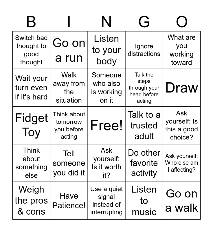 This bingo card has a free space and 34 words: Take 3 deep breaths, Stop, Count to 10, Raise your hand instead of blurting out, Ask yourself: Is this a good choice?, Wait your turn even if it's hard, Walk away from the situation, Use a quiet signal instead of interrupting, Talk the steps through your head before acting, Go on a walk, Fidget Toy, Go on a run, Listen to music, Stretch your body to release energy, Think about something else, Think about tomorrow you before acting, Ask yourself: Is it worth it?, Talk to a trusted adult, Ask yourself: Who else am I affecting?, Weigh the pros & cons, Have Patience!, Write down your thoughts instead of blurting them out, Ignore distractions, Draw, Be proud of controlling yourself, Tell someone you did it, Listen to your body, Listen to your thoughts, What are you working toward, Switch bad thought to good thought, Writing it down, Someone who also is working on it, Do other favorite activity and I start swearing.