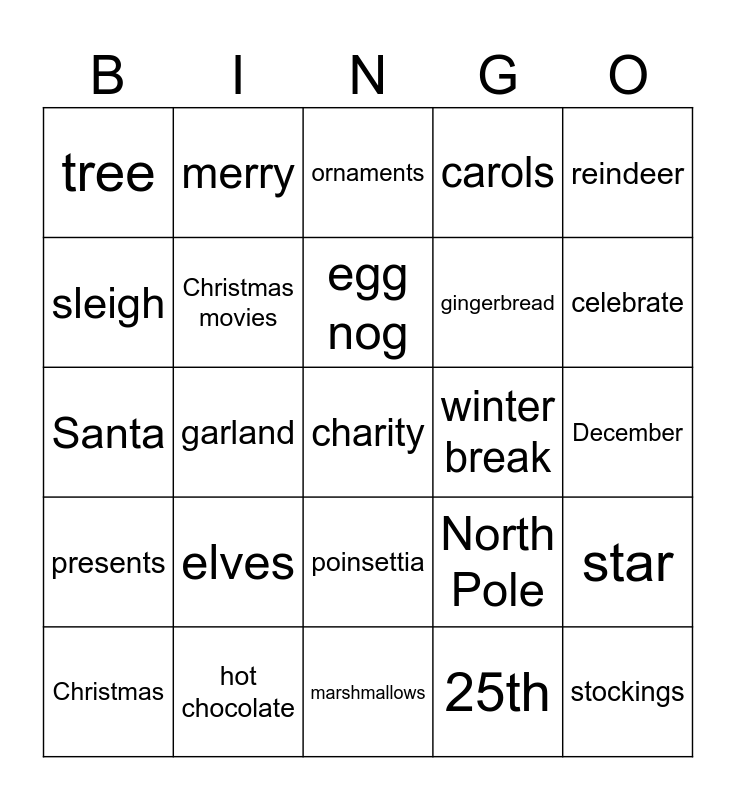This bingo card has a free space and 29 words: Christmas, bow, garland, lights, tree, ornaments, Christmas movies, elves, winter break, hot chocolate, December, stockings, marshmallows, 25th, celebrate, Grinch, poinsettia, presents, reindeer, Santa, North Pole, candy cane, gingerbread, sleigh, carols, merry, star, egg nog and holiday.
