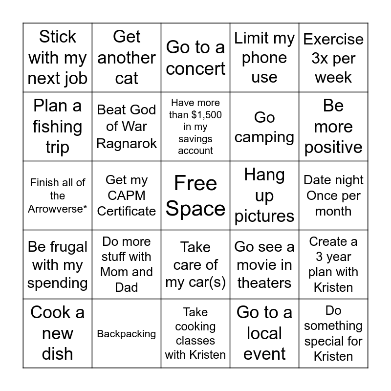 This bingo card has a free space and 24 words: Do more stuff with Mom and Dad, Backpacking, Have more than $1,500 in my savings account, Cook a new dish, Exercise 3x per week, Stick with my next job, Plan a fishing trip, Get another cat, Hang up pictures, Take care of my car(s), Go camping, Finish all of the Arrowverse*, Go see a movie in theaters, Create a 3 year plan with Kristen, Beat God of War Ragnarok, Go to a local event, Date night Once per month, Go to a concert, Be more positive, Get my CAPM Certificate, Do something special for Kristen, Be frugal with my spending, Limit my phone use and Take cooking classes with Kristen.