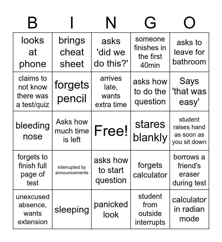 This bingo card has a free space and 24 words: interrupted by announcements, sleeping, arrives late, wants extra time, unexcused absence, wants extension, asks to leave for bathroom, looks at phone, claims to not know there was a test/quiz, brings cheat sheet, stares blankly, asks how to start question, asks how to do the question, bleeding nose, forgets calculator, borrows a friend's eraser during test, forgets pencil, student from outside interrupts, student raises hand as soon as you sit down, asks 'did we do this?', Says 'that was easy', Asks how much time is left, calculator in radian mode, forgets to finish full page of test, someone finishes in the first 40min and panicked look.