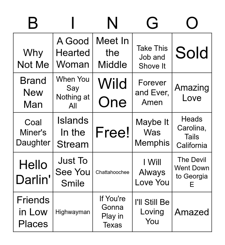 This bingo card has a free space and 25 words: Just To See You Smile, If You're Gonna Play in Texas, Wild One, Friends in Low Places, Sold, Why Not Me, Brand New Man, A Good Hearted Woman, Maybe It Was Memphis, Chattahoochee, Forever and Ever, Amen, Coal Miner's Daughter, I Will Always Love You, The Devil Went Down to Georgia E, When You Say Nothing at All, He Stopped Loving Her Today, Heads Carolina, Tails California, Meet In the Middle, Amazing Love, Islands In the Stream, Amazed, Highwayman, Hello Darlin', Take This Job and Shove It and I'll Still Be Loving You.