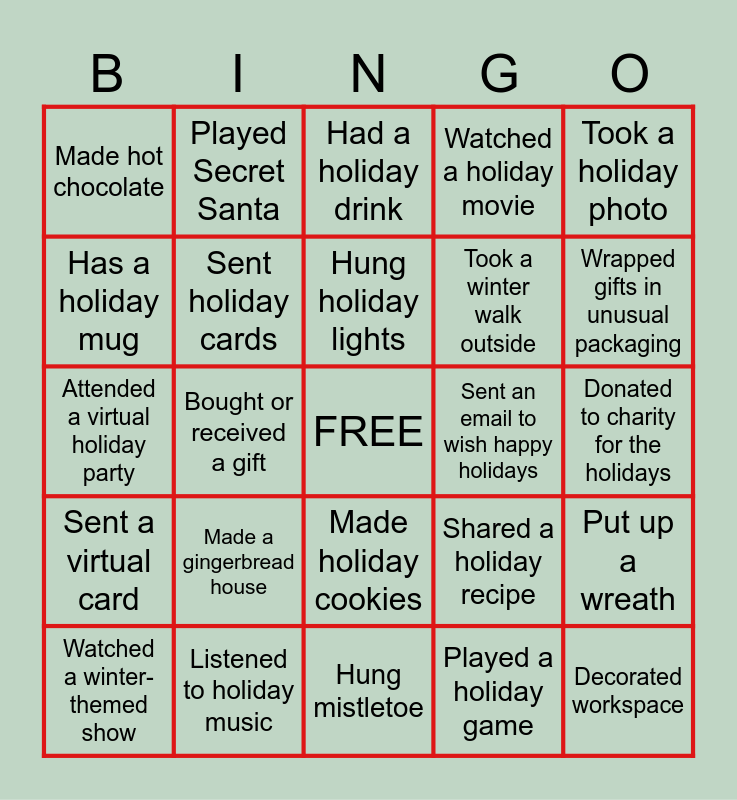 This bingo card has a free space and 35 words: Sipping hot chocolate, Wore a holiday sweater, Decorated a tree, Sent holiday cards, Made holiday cookies, Watched a holiday movie, Has a holiday mug, Wrapped a present, Hung holiday lights, Built a snowman, Attended a virtual holiday party, Took a holiday photo, Hung stockings, Wore holiday socks, Made hot chocolate, Sent an email to wish happy holidays, Played a holiday game, Bought or received a gift, Sent a virtual card, Decorated workspace, Shared a holiday recipe, Watched a winter-themed show, Put up a wreath, Listened to holiday music, Had a holiday drink, Wrapped gifts in unusual packaging, Sent a gift online, Made a handmade gift, Took a winter walk outside, Donated to charity for the holidays, Attended a holiday concert or event, Hung mistletoe, Made a gingerbread house, Played Secret Santa and Wore a festive hat.