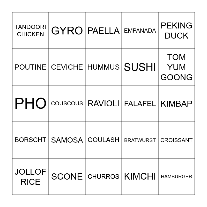 This bingo card has 28 words: CROISSANT, TACOS, SUSHI, KIMCHI, POUTINE, PAELLA, GYRO, BORSCHT, FALAFEL, JOLLOF RICE, PHO, EMPANADA, SCONE, CHURROS, TOM YUM GOONG, BANH MI, SAMOSA, CEVICHE, HUMMUS, GOULASH, TANDOORI CHICKEN, HAMBURGER, RAVIOLI, COUSCOUS, KIMBAP, BRATWURST, PEKING DUCK and BAKLAVA.