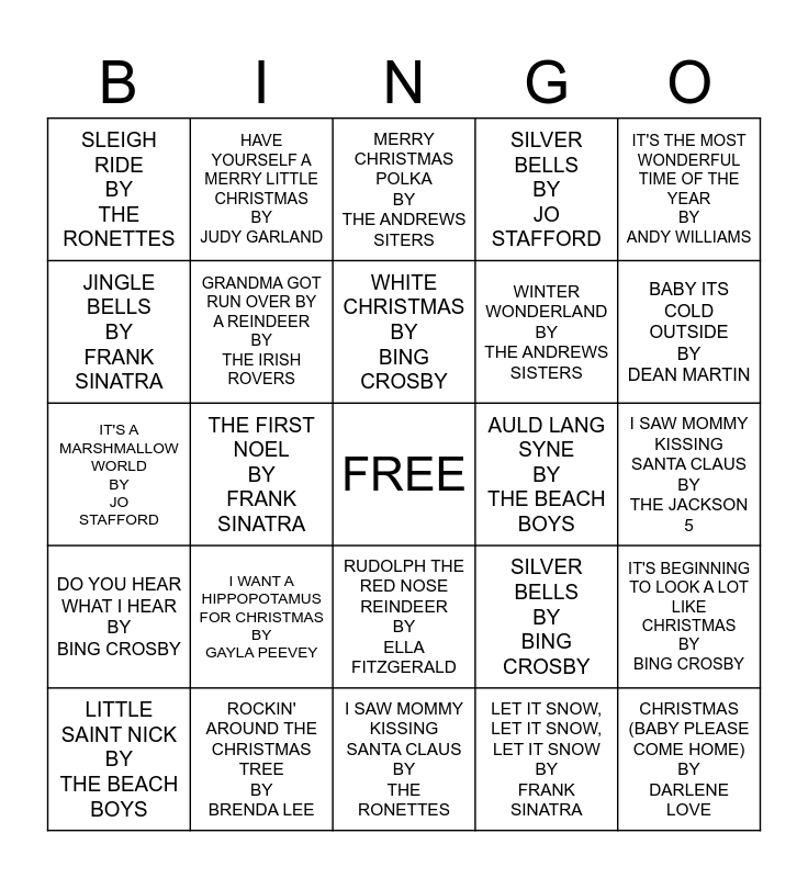 This bingo card has a free space and 26 words: RUDOLPH THE RED NOSE REINDEER BY ELLA FITZGERALD, LET IT SNOW, LET IT SNOW, LET IT SNOW BY FRANK SINATRA, WHITE CHRISTMAS BY BING CROSBY, ROCKIN' AROUND THE CHRISTMAS TREE BY BRENDA LEE, IT'S THE MOST WONDERFUL TIME OF THE YEAR BY ANDY WILLIAMS, SLEIGH RIDE BY THE RONETTES, JINGLE BELLS BY FRANK SINATRA, HAVE YOURSELF A MERRY LITTLE CHRISTMAS BY JUDY GARLAND, I SAW MOMMY KISSING SANTA CLAUS BY THE JACKSON 5, SILVER BELLS BY BING CROSBY, WINTER WONDERLAND BY THE ANDREWS SISTERS, IT'S A MARSHMALLOW WORLD BY JO STAFFORD, IT'S BEGINNING TO LOOK A LOT LIKE CHRISTMAS BY BING CROSBY, LITTLE SAINT NICK BY THE BEACH BOYS, THE FIRST NOEL BY FRANK SINATRA, A HOLLY JOLLY CHRISTMAS BY BURL IVES, SILVER BELLS BY JO STAFFORD, DO YOU HEAR WHAT I HEAR BY BING CROSBY, MERRY CHRISTMAS POLKA BY THE ANDREWS SITERS, CHRISTMAS (BABY PLEASE COME HOME) BY DARLENE LOVE, BABY ITS COLD OUTSIDE BY DEAN MARTIN, I SAW MOMMY KISSING SANTA CLAUS BY THE RONETTES, AULD LANG SYNE BY THE BEACH BOYS, I WANT A HIPPOPOTAMUS FOR CHRISTMAS BY GAYLA PEEVEY, GRANDMA GOT RUN OVER BY A REINDEER BY THE IRISH ROVERS and UP ON THE ROOFTOP BY CHARLIE HOPE.