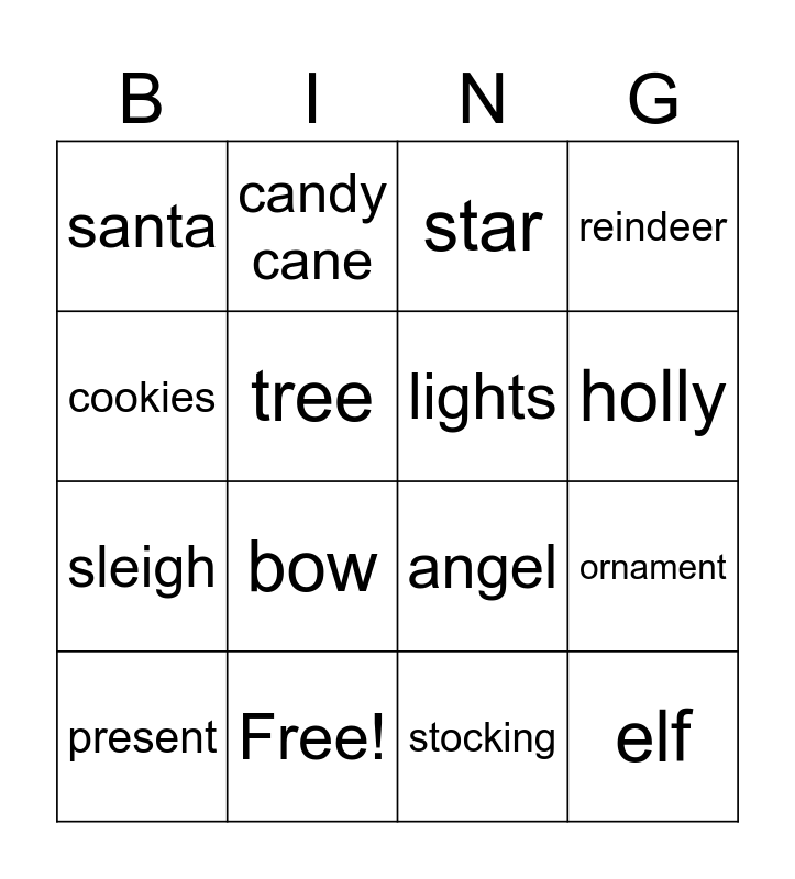 This bingo card has 16 words: Free!, ornament, star, santa, sleigh, candy cane, angel, stocking, cookies, tree, present, reindeer, bow, holly, lights and elf.