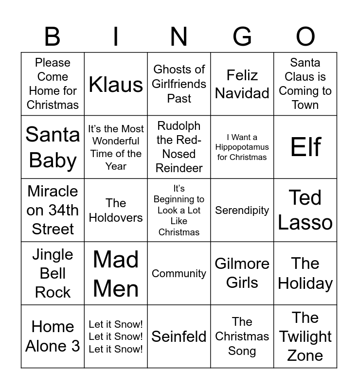 This bingo card has 60 words: Rockin’ Around the Christmas Tree, Let it Snow! Let it Snow! Let it Snow!, Baby Please Come Home, Jingle Bell Rock, The Christmas Song, Sleigh Ride, It’s the Most Wonderful Time of the Year, Run Rudolph Run, I Want a Hippopotamus for Christmas, White Christmas, Feliz Navidad, Deck the Hall, Santa Baby, Blue Christmas, A Holly Jolly Christmas, Please Come Home for Christmas, It’s Beginning to Look a Lot Like Christmas, Santa Claus is Coming to Town, Have Yourself A Merry Little Christmas, Rudolph the Red-Nosed Reindeer, Serendipity, Ghosts of Girlfriends Past, Home Alone 3, The Holiday, Just Friends, 8 Crazy Nights, The Grinch, The Santa Clause, Elf, Christmas with the Kranks, Bad Santa, Love Actually, Jingle All The Way, The Family Stone, Klaus, Unaccompanied Minors, Muppet Christmas Carol, The Holdovers, The Christmas Chronicles, Miracle on 34th Street, Friends, Mad Men, Ted Lasso, How I Met Your Mother, Gilmore Girls, The X-Files, New Girl, It’s Always Sunny in Philadelphia, Boy Meets World, Community, Seinfeld, Glee, The Mindy Project, Buffy the Vampire Slayer, The O.C., 30 Rock, The Office, The Fresh Prince of Bel-Air, The Twilight Zone and The West Wing.