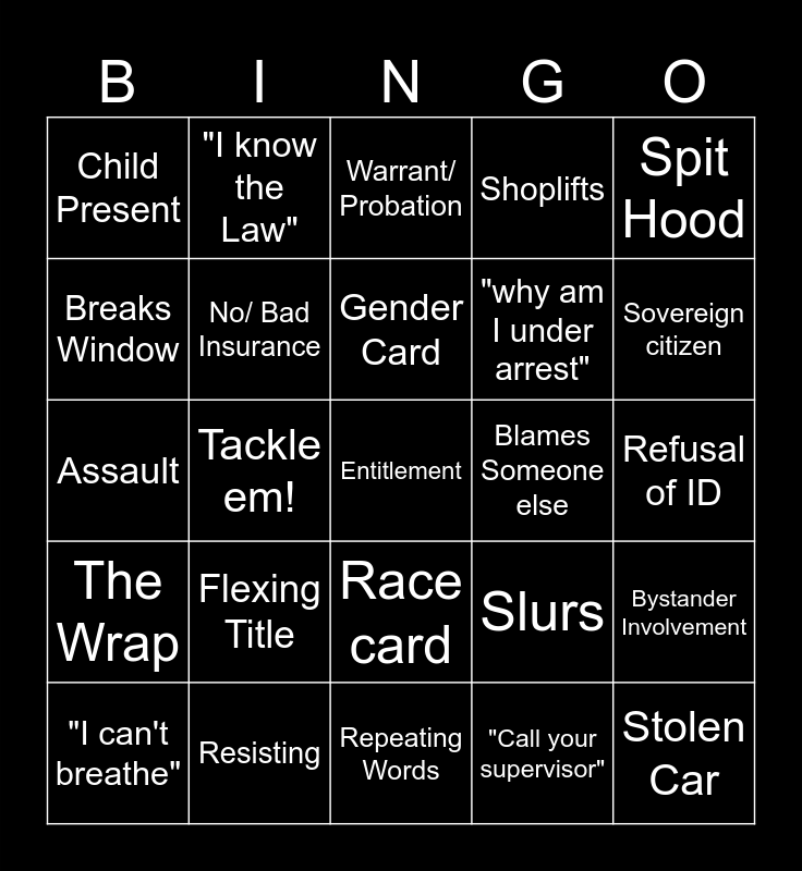 This bingo card has a free space and 39 words: EIPV, RDW, Talks about rights, No/ Bad Insurance, "I can't breathe", Race card, Gender Card, Assault on a LEO, Spit Hood, The Wrap, Tackle em!, Shoplifts, Stolen Car, Refusal of ID, Blames Someone else, Flexing Title, UI, Child Present, Constant Profanity, Slurs, Breaks Window, Repeating Words, "why am I under arrest", Sovereign citizen, Public Indecency, Recording, "Record this!", Leg Restraints, Police Retaliation, "I know the Law", Backseat Headbanger, Banshee Scream, Warrant/ Probation, Resisting, "Call your supervisor", Goes Limp, Bystander Involvement, Assault and Crazy Ex.