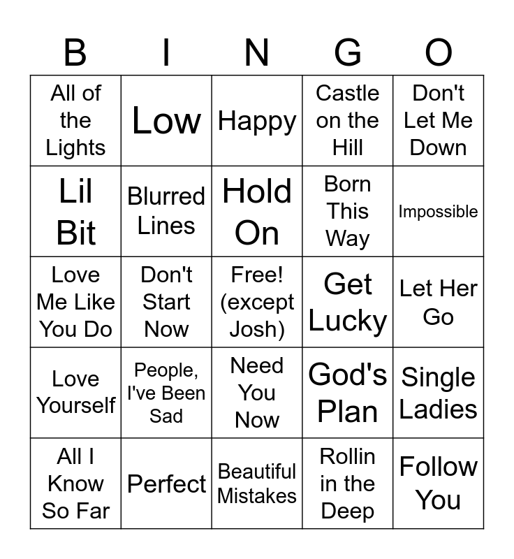 This bingo card has a free space and 56 words: 7 Summers, All I Know So Far, All of Me, All of the Lights, Beautiful Mistakes, Billionaire, Blurred Lines, Boom Boom Pow, Born This Way, Call Me Maybe, Castle on the Hill, Cheerleader, Con Altura, Cooler Than Me, Despacito, Dirt Road Anthem, Don't Let Me Down, Don't Start Now, Firework, Follow You, Get Lucky, Ghost, God's Plan, Happy, Hey, Soul Sister, Hold On, Humble, I Did It, Impossible, Irreplacable, Just Dance, Just the Way You Are, La La La, Leave the Door Open, Let Her Go, Lil Bit, Love Me Like You Do, Love Story, Love Yourself, Low, Need You Now, Old Town Road, OMG, One Dance, Peaches, People, I've Been Sad, Perfect, Poker Face, Rather Be, Remind Me, Rollin in the Deep, Save Your Tears, See You Again, Shape of You, Single Ladies and Somebody That I Used to Know.