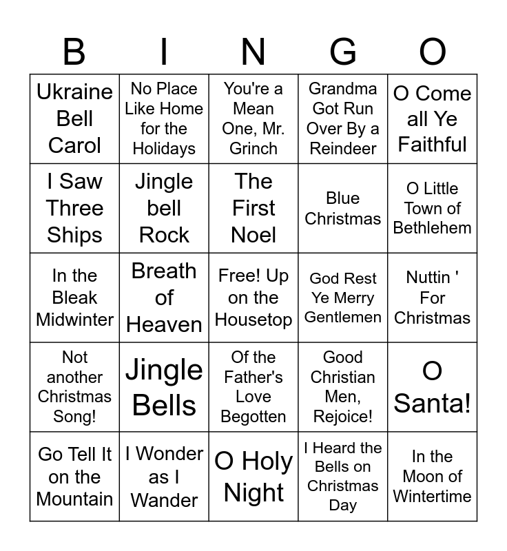 This bingo card has a free space and 24 words: Jingle Bells, I Wonder as I Wander, The First Noel, Go Tell It on the Mountain, O Come all Ye Faithful, Ukraine Bell Carol, I Saw Three Ships, No Place Like Home for the Holidays, God Rest Ye Merry Gentlemen, Of the Father's Love Begotten, Blue Christmas, In the Bleak Midwinter, Good Christian Men, Rejoice!, O Santa!, Jingle bell Rock, I Heard the Bells on Christmas Day, Nuttin ' For Christmas, You're a Mean One, Mr. Grinch, O Little Town of Bethlehem, Breath of Heaven, In the Moon of Wintertime, Not another Christmas Song!, Grandma Got Run Over By a Reindeer and O Holy Night.