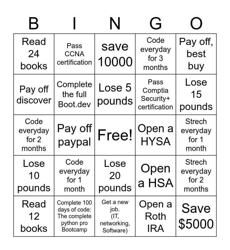 This bingo card has a free space and 24 words: Code everyday for 1 month, Complete 100 days of code: The complete python pro Bootcamp, Lose 5 pounds, Read 12 books, Pay off, best buy, Read 24 books, Pay off discover, Pass CCNA certification, Open a HYSA, Lose 20 pounds, Pass Comptia Security+ certification, Code everyday for 2 months, Open a HSA, Strech everyday for 2 months, Complete the full Boot.dev, Open a Roth IRA, Strech everyday for 1 month, save 10000, Lose 15 pounds, Pay off paypal, Save $5000, Lose 10 pounds, Code everyday for 3 months and Get a new job. (IT, networking, Software).