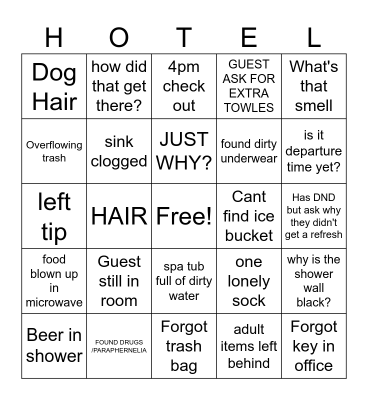 This bingo card has a free space and 24 words: Guest still in room, FOUND DRUGS /PARAPHERNELIA, JUST WHY?, Beer in shower, What's that smell, Dog Hair, Overflowing trash, how did that get there?, Cant find ice bucket, spa tub full of dirty water, found dirty underwear, left tip, one lonely sock, why is the shower wall black?, sink clogged, adult items left behind, Has DND but ask why they didn't get a refresh, 4pm check out, is it departure time yet?, HAIR, Forgot key in office, food blown up in microwave, GUEST ASK FOR EXTRA TOWLES and Forgot trash bag.