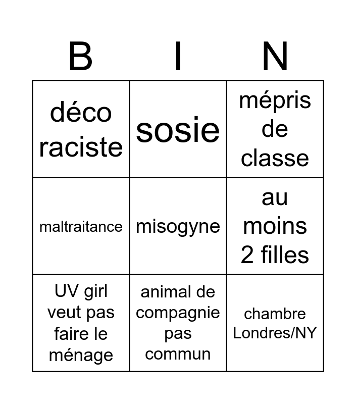 This bingo card has a free space and 8 words: au moins 2 filles, mépris de classe, sosie, UV girl veut pas faire le ménage, déco raciste, chambre Londres/NY, maltraitance and animal de compagnie pas commun.