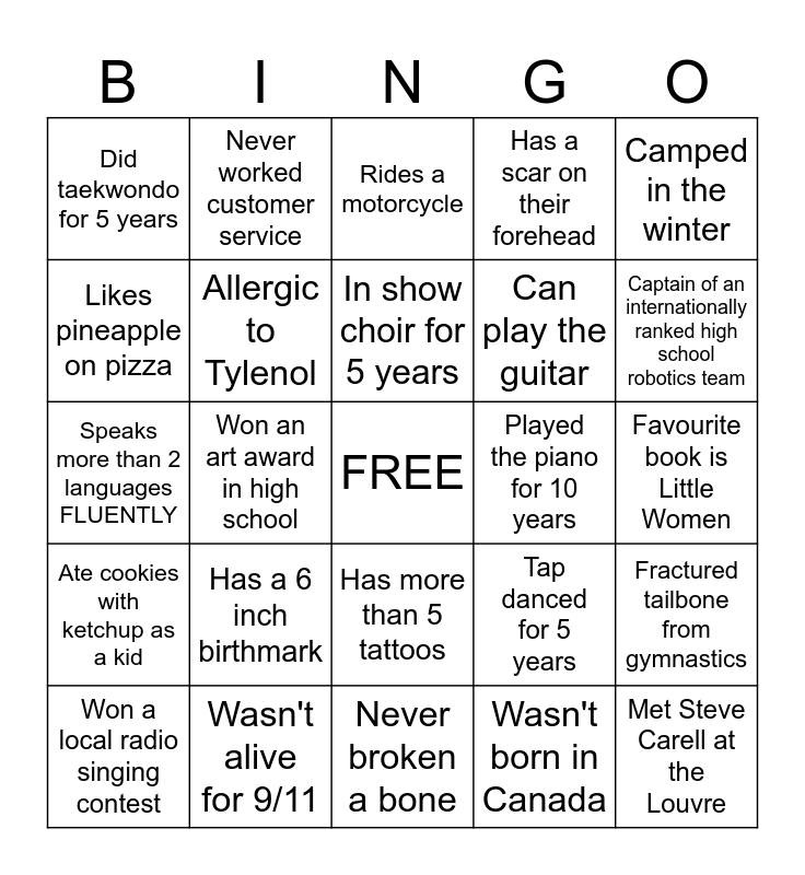 This bingo card has a free space and 36 words: Woke up from anesthesia mid surgery, Played the drums for 5 years, Black belt in abacus, Allergic to Tylenol, Tap danced for 5 years, Ate cookies with ketchup as a kid, In show choir for 5 years, Has scoliosis, Camped in the winter, Shot and eaten a squirrel, Won an art award in high school, Has a scar on their forehead, Can put both feet behind their head, Played the piano for 10 years, Captain of an internationally ranked high school robotics team, Did taekwondo for 5 years, Has a severe cat allergy, Has a 6 inch birthmark, Met Steve Carell at the Louvre, Rides a motorcycle, Favourite book is Little Women, Fractured tailbone from gymnastics, Wasn't alive for 9/11, Won a local radio singing contest, Never broken a bone, Never worked customer service, Speaks more than 2 languages FLUENTLY, Can't swim, Can play the guitar, Likes pineapple on pizza, Visited more than 5 countries, Can rock climb, Wasn't born in Canada, Has more than 5 tattoos, Can pole dance and Been to more than 10 concerts.