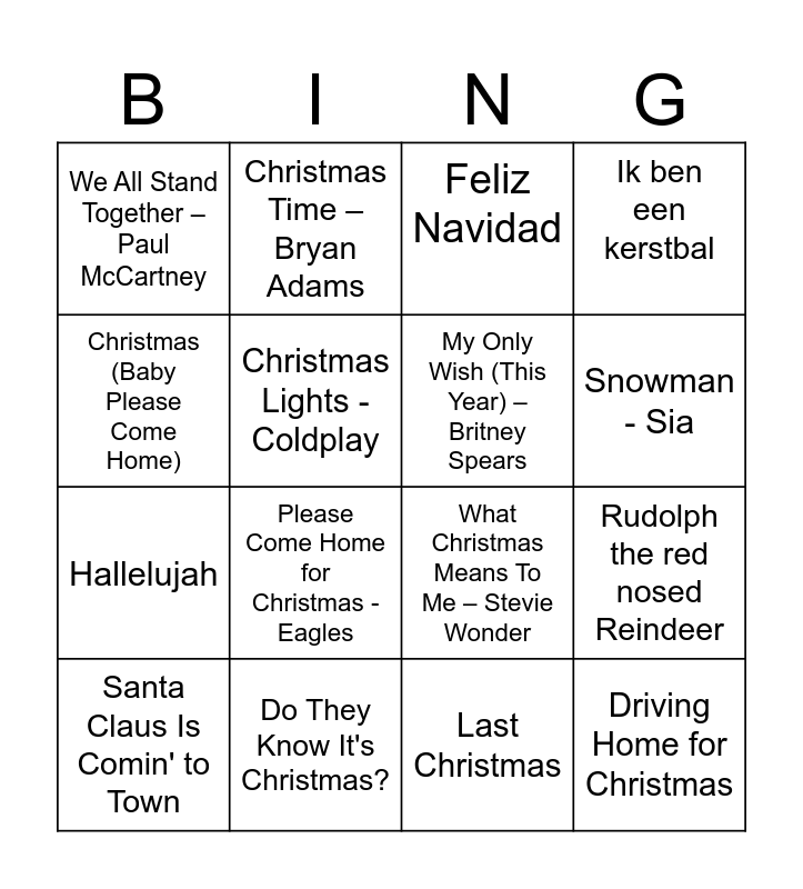 This bingo card has 23 words: Driving Home for Christmas, Thank God It’s Christmas - Queen, Snowman - Sia, Mistletoe – Justin Bieber, Christmas (Baby Please Come Home), We All Stand Together – Paul McCartney, Christmas Lights - Coldplay, Christmas Time – Bryan Adams, Santa Claus Is Comin' to Town, Lonely This Christmas, Please Come Home for Christmas - Eagles, Hallelujah, Shake Up Christmas, Sleigh Ride - Carpenters, Do They Know It's Christmas?, 2000 Miles - Pretenders, Feliz Navidad, What Christmas Means To Me – Stevie Wonder, My Only Wish (This Year) – Britney Spears, Rudolph the red nosed Reindeer, Ik ben een kerstbal, Last Christmas and Eenzame kerst.