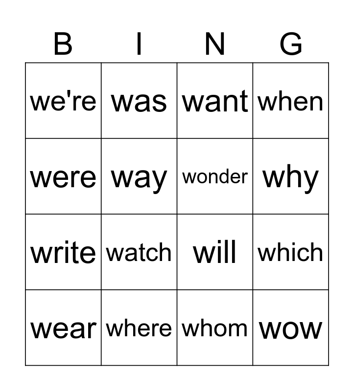 This bingo card has 20 words: which, with, want, went, wear, were, where, we're, write, was, watch, will, way, wow, wonder, what, why, when, whom and whose.