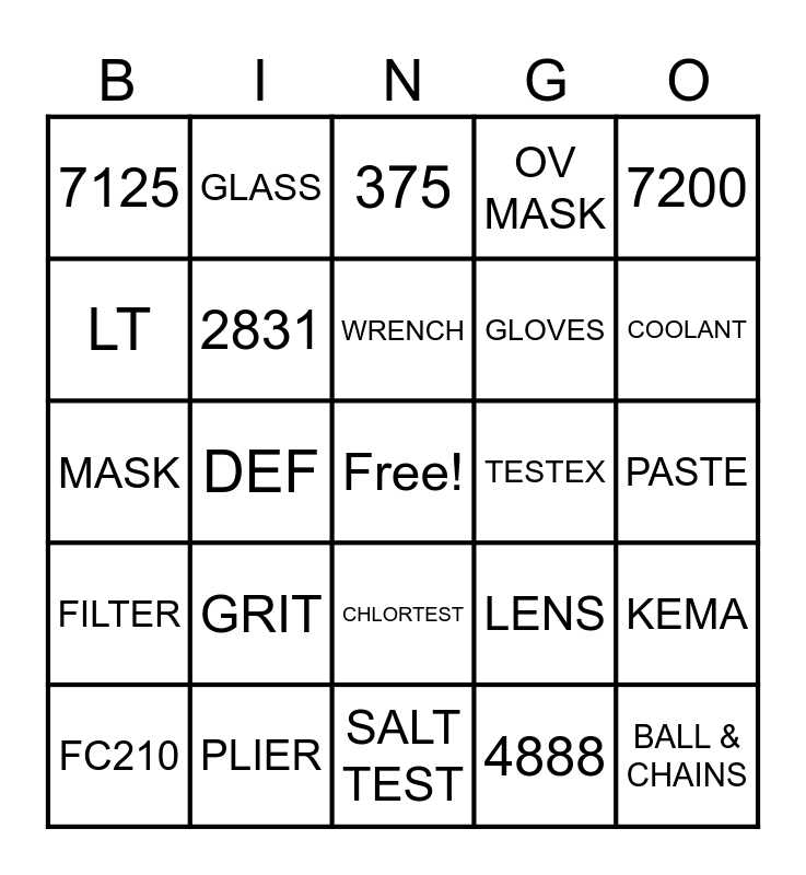 This bingo card has a free space and 24 words: GRIT, PLIER, WRENCH, FC210, 7200, 7125, LT, GLASS, TESTEX, CHLORTEST, GLOVES, MASK, LENS, KEMA, 2831, 4888, PASTE, 375, COOLANT, DEF, BALL & CHAINS, FILTER, OV MASK and SALT TEST.