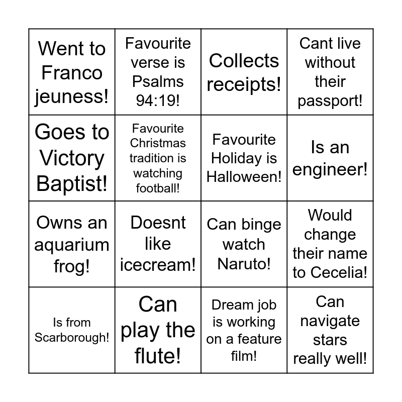 This bingo card has 16 words: Can play the flute!, Would change their name to Cecelia!, Collects receipts!, Went to Franco jeuness!, Owns an aquarium frog!, Favourite verse is Psalms 94:19!, Can binge watch Naruto!, Dream job is working on a feature film!, Goes to Victory Baptist!, Favourite Christmas tradition is watching football!, Is from Scarborough!, Cant live without their passport!, Doesnt like icecream!, Is an engineer!, Favourite Holiday is Halloween! and Can navigate stars really well!.