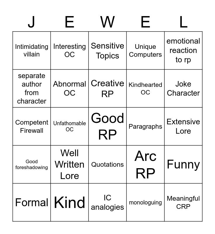 This bingo card has a free space and 24 words: Well Written Lore, Kind, Creative RP, Formal, emotional reaction to rp, Intimidating villain, separate author from character, Interesting OC, Paragraphs, Quotations, Kindhearted OC, Competent Firewall, Arc RP, Funny, Abnormal OC, monologuing, Extensive Lore, Sensitive Topics, Joke Character, Unfathomable OC, Meaningful CRP, Good foreshadowing, Unique Computers and IC analogies.