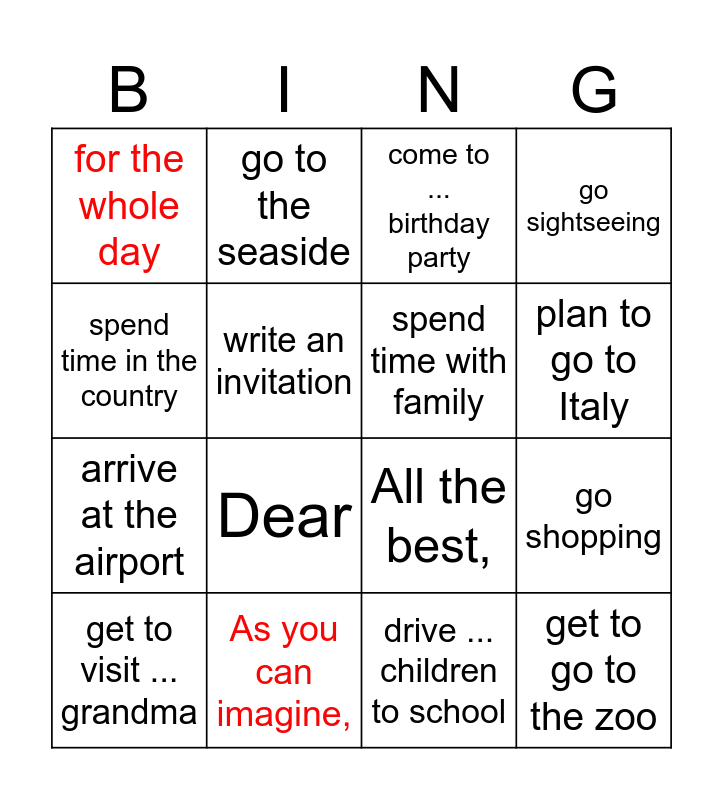 This bingo card has 17 words: drive ... children to school, get to visit ... grandma, come to ... birthday party, for the whole day, Dear, go sightseeing, go shopping, spend time with family, plan to go to Italy, write an invitation, As you can imagine,, All the best,, spend time in the country, go to the seaside, arrive at the airport, go away and get to go to the zoo.