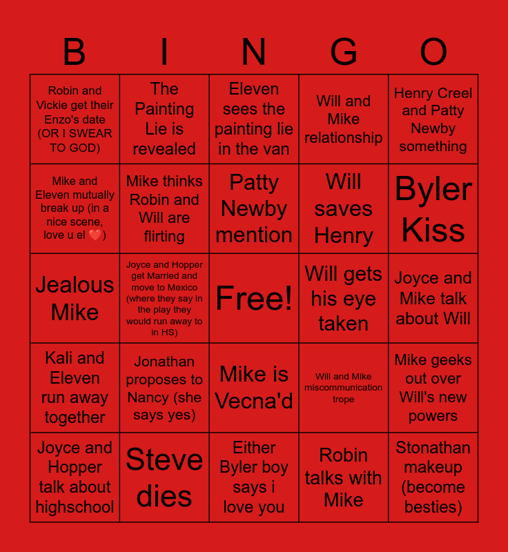 This bingo card has a free space and 24 words: Jonathan proposes to Nancy (she says yes), Steve dies, Patty Newby mention, Joyce and Hopper talk about highschool, Henry Creel and Patty Newby something, Robin and Vickie get their Enzo's date (OR I SWEAR TO GOD), Mike and Eleven mutually break up (in a nice scene, love u el ❤️), The Painting Lie is revealed, Will gets his eye taken, Mike is Vecna'd, Will saves Henry, Jealous Mike, Will and Mike miscommunication trope, Mike geeks out over Will's new powers, Mike thinks Robin and Will are flirting, Robin talks with Mike, Joyce and Mike talk about Will, Eleven sees the painting lie in the van, Byler Kiss, Joyce and Hopper get Married and move to Mexico (where they say in the play they would run away to in HS), Stonathan makeup (become besties), Kali and Eleven run away together, Will and Mike relationship and Either Byler boy says i love you.
