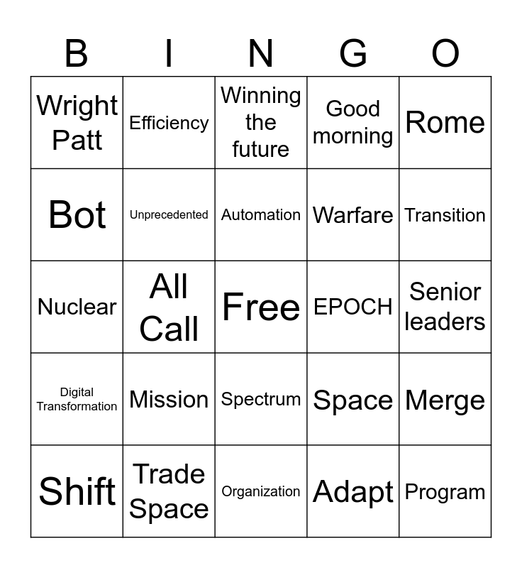 This bingo card has a free space and 24 words: Mission, Trade Space, Automation, Shift, Rome, Wright Patt, Bot, Efficiency, EPOCH, Spectrum, Warfare, Nuclear, Space, Merge, Unprecedented, Adapt, Senior leaders, Winning the future, Transition, All Call, Program, Digital Transformation, Good morning and Organization.