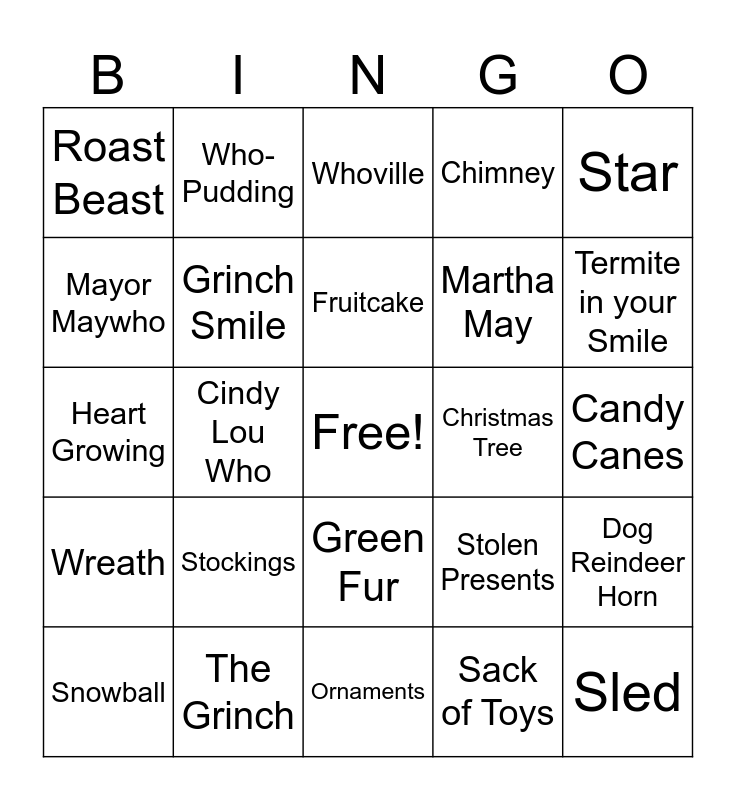 This bingo card has a free space and 30 words: The Grinch, Max, Cindy Lou Who, Mount Crumpit, Roast Beast, Whoville, Grinch Smile, Green Fur, Christmas Tree, Ornaments, Candy Canes, Sled, Sack of Toys, 3 Sizes Too Small, Termite in your Smile, Seasick Crocodile, Stolen Presents, Wreath, Stockings, Star, Heart Growing, Carved the Roast Beast, Who-Pudding, Martha May, Mayor Maywho, Chimney, Dog Reindeer Horn, Snowball, Fruitcake and Blue Ribbon.