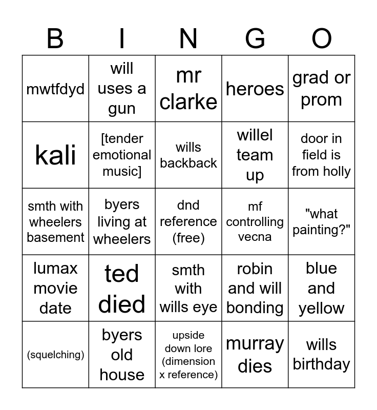 This bingo card has a free space and 24 words: ted died, byers old house, wills backback, (squelching), grad or prom, mwtfdyd, kali, will uses a gun, mf controlling vecna, smth with wills eye, willel team up, smth with wheelers basement, robin and will bonding, blue and yellow, [tender emotional music], murray dies, "what painting?", mr clarke, door in field is from holly, byers living at wheelers, wills birthday, lumax movie date, heroes and upside down lore (dimension x reference).