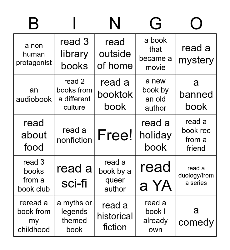 This bingo card has a free space and 32 words: read a book I already own, read 3 books, read a nonfiction, read 3 essays or short stories, read 3 books from a book club, read 2 books from a different culture, read a mystery, read a duology/from a series, read 3 library books, read a comic/graphic novel, read a booktok book, read outside of home, replace an hour of scrolling with reading x 12, read a canadian author, read a holiday book, read a 400 page book, reread a book from my childhood, read about food, read a book by a queer author, read a sci-fi, read a YA, read a book from 2026, read a book rec from a friend, a myths or legends themed book, a comedy, a book that became a movie, a new book by an old author, an audiobook, a non human protagonist, read a historical fiction, a BIPOC author and a banned book.