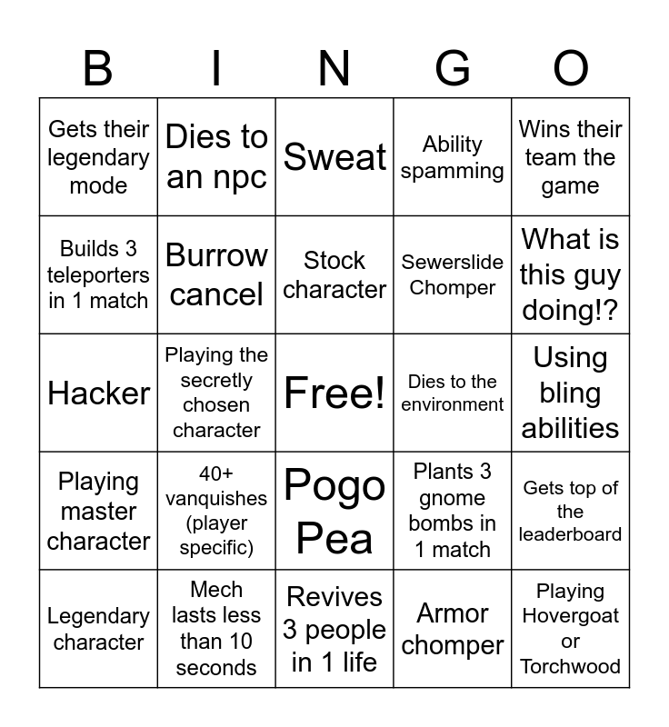 This bingo card has a free space and 25 words: 40+ vanquishes (player specific), Revives 3 people in 1 life, Stock character, Legendary character, Wins their team the game, Gets their legendary mode, Builds 3 teleporters in 1 match, Dies to an npc, Dies to the environment, Pogo Pea, Sewerslide Chomper, Hacker, Plants 3 gnome bombs in 1 match, Gets top of the leaderboard, Burrow cancel, Armored heal station, Using bling abilities, Sweat, What is this guy doing!?, Playing the secretly chosen character, Playing Hovergoat or Torchwood, Mech lasts less than 10 seconds, Playing master character, Ability spamming and Armor chomper.
