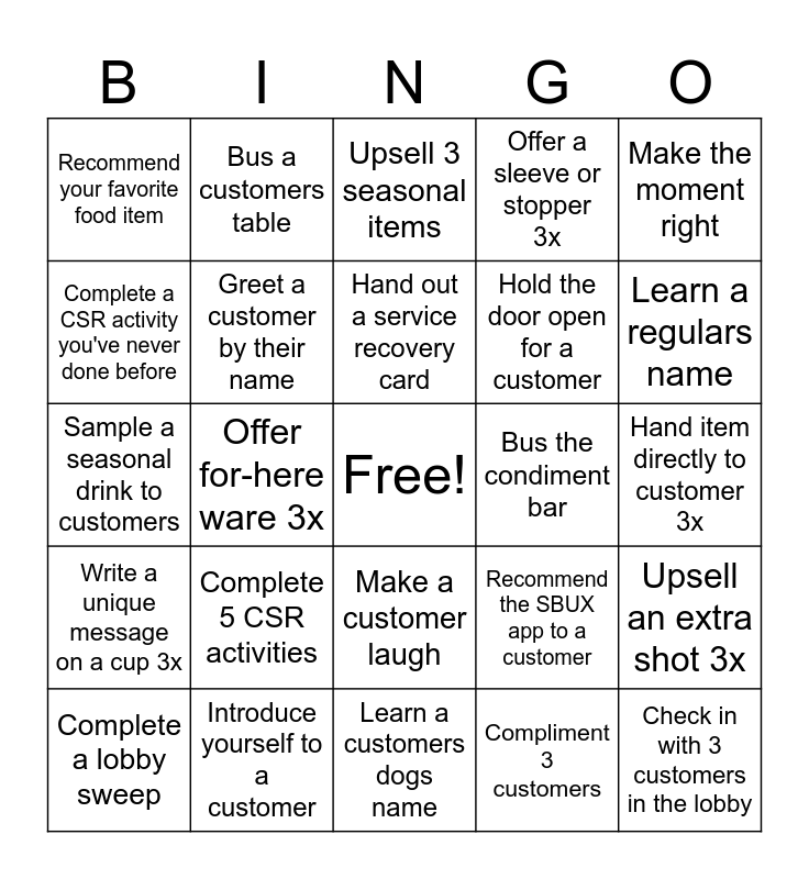 This bingo card has a free space and 24 words: Complete 5 CSR activities, Introduce yourself to a customer, Hand out a service recovery card, Complete a lobby sweep, Make the moment right, Recommend your favorite food item, Complete a CSR activity you've never done before, Bus a customers table, Bus the condiment bar, Make a customer laugh, Hold the door open for a customer, Sample a seasonal drink to customers, Recommend the SBUX app to a customer, Upsell an extra shot 3x, Greet a customer by their name, Compliment 3 customers, Hand item directly to customer 3x, Upsell 3 seasonal items, Learn a regulars name, Offer for-here ware 3x, Check in with 3 customers in the lobby, Write a unique message on a cup 3x, Offer a sleeve or stopper 3x and Learn a customers dogs name.