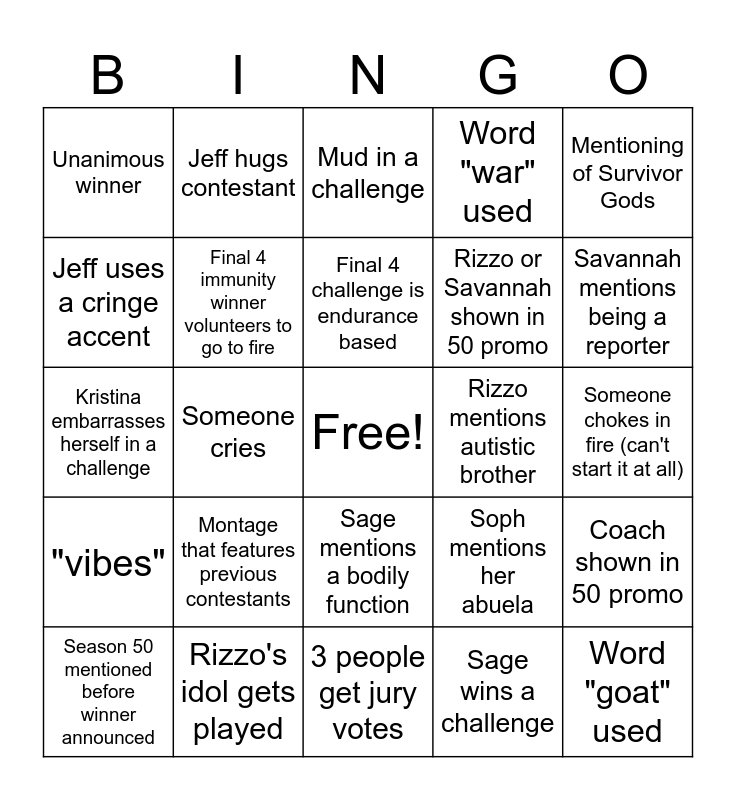 This bingo card has a free space and 33 words: Someone other than Rizzo says "R-I-Z-G-O-D", "That's the crazy thing about this game", Someone cries, "Cinema", "vibes", Final 4 immunity winner volunteers to go to fire, Mentioning of Survivor Gods, Season 50 mentioned before winner announced, Jeff hugs contestant, "Uncle J", Final 4 challenge is endurance based, Mud in a challenge, "I didn't come here to make friends", Dramatic shots of jury members before FTC, Rizzo mentions autistic brother, Savannah mentions being a reporter, Rizzo's idol gets played, Kristina embarrasses herself in a challenge, Montage that features previous contestants, Soph mentions her abuela, Sage mentions a bodily function, The prize money is mentioned, Unanimous winner, Someone chokes in fire (can't start it at all), 3 people get jury votes, Word "goat" used, Word "war" used, Rizzo or Savannah shown in 50 promo, Jeff uses a cringe accent, Coach shown in 50 promo, Savannah wins a challenge, Sage wins a challenge and Kristina goes to fire.