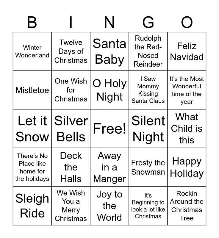 This bingo card has a free space and 44 words: All I want for Christmas is You, Rockin Around the Christmas Tree, Jingle Bell Rock, Sleigh Ride, Have Yourself a Merry Little Christmas, It’s Beginning to look a lot like Christmas, Santa Baby, Last Christmas, Feliz Navidad, We Wish You a Merry Christmas, Rudolph the Red-Nosed Reindeer, Silent Night, Away in a Manger, Deck the Halls, Jingle Bells, Joy to the World, Grandma Got run over by a reindeer, Let it Snow, Holly Jolly Christmas, It’s the Most Wonderful time of the year, Twelve Days of Christmas, O Come All Ye Faithful, Santa Claus is coming to town, Winter Wonderland, This Christmas, What Child is this, White Christmas, I’ll be home for Christmas, Frosty the Snowman, There’s No Place like home for the holidays, O Little Town of Bethlehem, Happy Holiday, The first noel, Little Drummer Boy, Silver Bells, We three Kings, Underneath the Tree, Santa Tell Me, O Holy Night, Mistletoe, I Saw Mommy Kissing Santa Claus, Give love on Christmas Day, One Wish for Christmas and Mary Did you Know.
