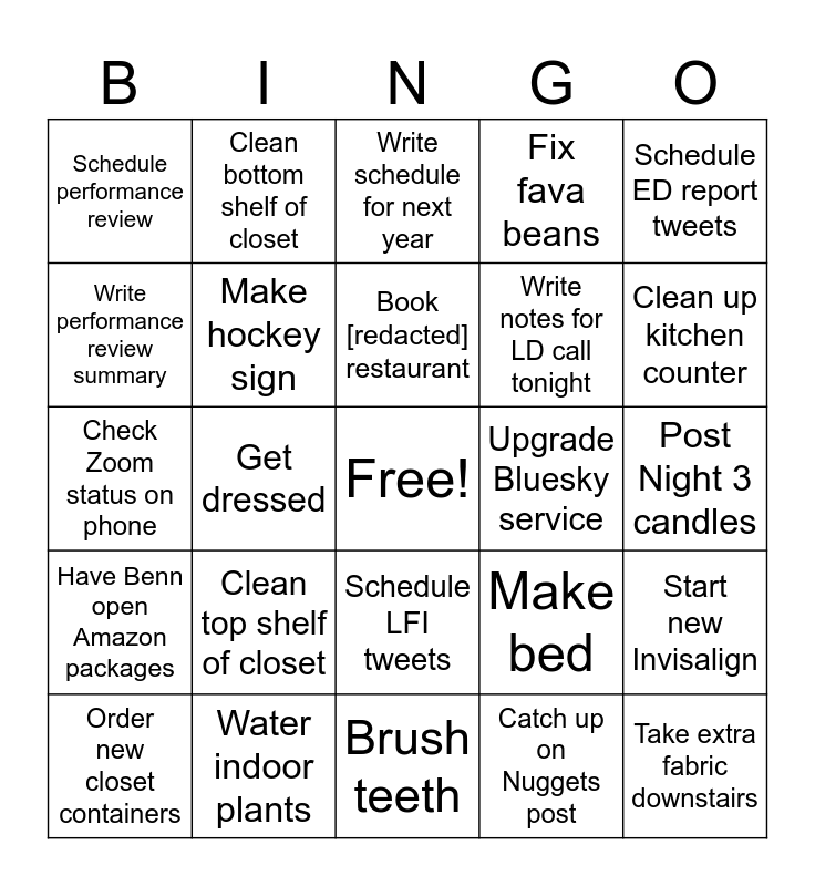 This bingo card has a free space and 24 words: Clean top shelf of closet, Water indoor plants, Book [redacted] restaurant, Order new closet containers, Schedule ED report tweets, Schedule performance review, Write performance review summary, Clean bottom shelf of closet, Upgrade Bluesky service, Schedule LFI tweets, Write notes for LD call tonight, Check Zoom status on phone, Make bed, Start new Invisalign, Make hockey sign, Catch up on Nuggets post, Post Night 3 candles, Write schedule for next year, Clean up kitchen counter, Get dressed, Take extra fabric downstairs, Have Benn open Amazon packages, Fix fava beans and Brush teeth.