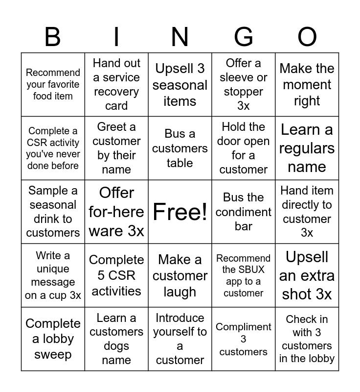 This bingo card has a free space and 24 words: Complete 5 CSR activities, Learn a customers dogs name, Bus a customers table, Complete a lobby sweep, Make the moment right, Recommend your favorite food item, Complete a CSR activity you've never done before, Hand out a service recovery card, Bus the condiment bar, Make a customer laugh, Hold the door open for a customer, Sample a seasonal drink to customers, Recommend the SBUX app to a customer, Upsell an extra shot 3x, Greet a customer by their name, Compliment 3 customers, Hand item directly to customer 3x, Upsell 3 seasonal items, Learn a regulars name, Offer for-here ware 3x, Check in with 3 customers in the lobby, Write a unique message on a cup 3x, Offer a sleeve or stopper 3x and Introduce yourself to a customer.