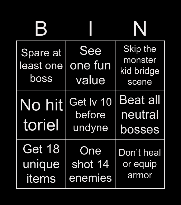 This bingo card has 9 words: Get 18 unique items, Skip the monster kid bridge scene, See one fun value, No hit toriel, Spare at least one boss, Beat all neutral bosses, Get lv 10 before undyne, Don’t heal or equip armor and One shot 14 enemies.