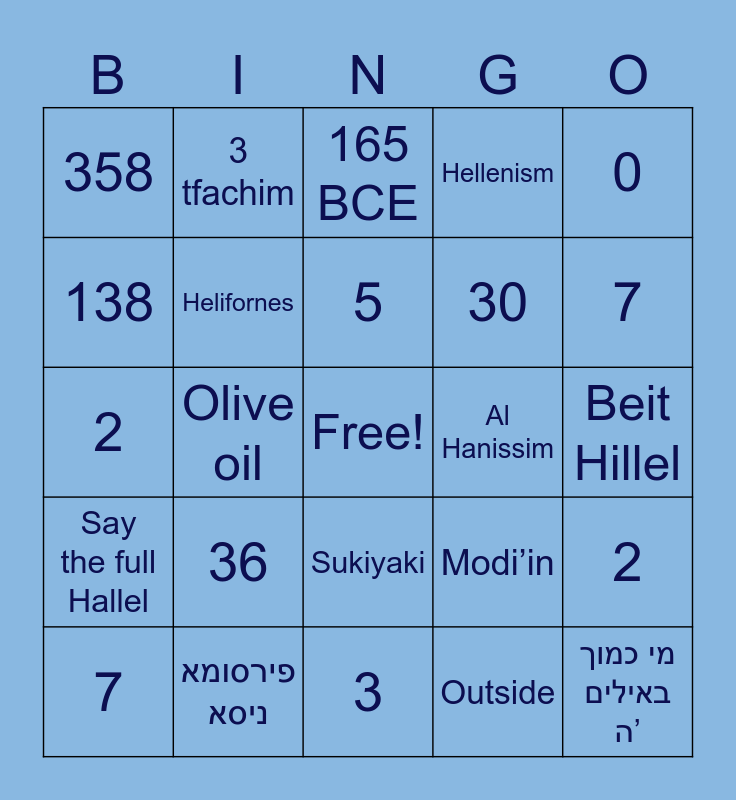 This bingo card has a free space and 25 words: 36, 3, 5, 7, 0, 358, 138, 3 tfachim, Al Hanissim, Sukiyaki, 30, 2, Modi’in, 2, Helifornes, Left, Beit Hillel, 165 BCE, 7, Olive oil, מי כמוך באילים ה’, פירסומא ניסא, Say the full Hallel, Hellenism and Outside.