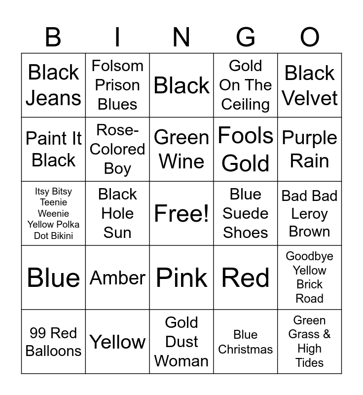 This bingo card has a free space and 59 words: Little Red Corvette, Yellow, Green Eyes, Blue, Blue Christmas, Orange Crush, Rose-Colored Boy, Pink Cadillac, Fools Gold, White Blank Page, Gold On The Ceiling, Brown Eyed Girl, Paint It Black, Yellow Submarine, Black Dog, Black Jeans, Green Grass & High Tides, Black Velvet, Purple People Eater, Green Wine, Blue Suede Shoes, Black, 99 Red Balloons, Goodbye Yellow Brick Road, Ebony and Ivory, Red Red Wine, Red Right Hand, Blue Moon, Purple Rain, Pink Champagne, Purple Haze, Blue Monday, Big Yellow Taxi, Devil With A Blue Dress, Folsom Prison Blues, Behind Blue Eyes, White Wedding, Black Hole Sun, Black Or White, Itsy Bitsy Teenie Weenie Yellow Polka Dot Bikini, Back In Black, Amber, Bad Bad Leroy Brown, Touch Of Grey, Red Solo Cup, Big Green Tractor, Pink Houses, White Houses, Pink, Gold Dust Woman, Black Betty, Barefoot Blue Jean Night, Raspberry Beret, True Blue, Men In Black, Red, Heart Of Gold, Black Sabbath and White Horse.
