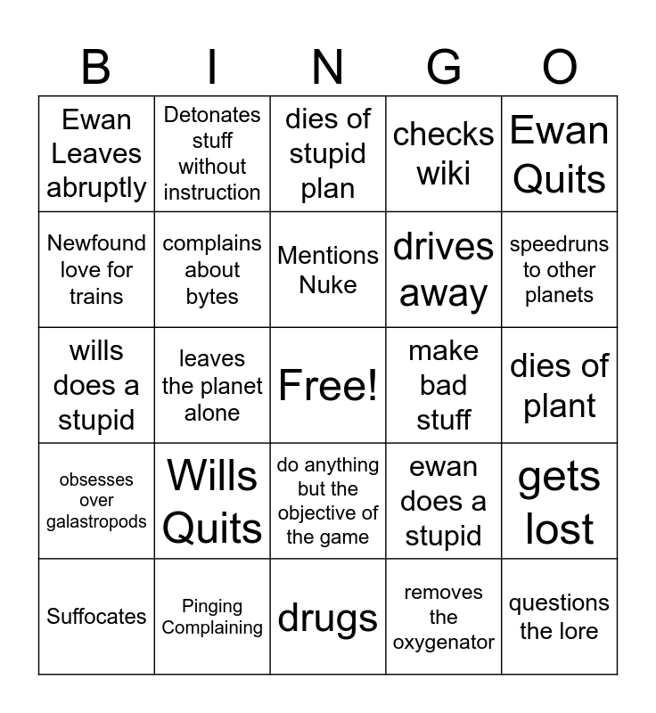This bingo card has a free space and 24 words: Wills Quits, Pinging Complaining, Mentions Nuke, Suffocates, Ewan Quits, Ewan Leaves abruptly, Newfound love for trains, Detonates stuff without instruction, make bad stuff, do anything but the objective of the game, drives away, wills does a stupid, ewan does a stupid, gets lost, complains about bytes, removes the oxygenator, dies of plant, dies of stupid plan, speedruns to other planets, leaves the planet alone, questions the lore, obsesses over galastropods, checks wiki and drugs.