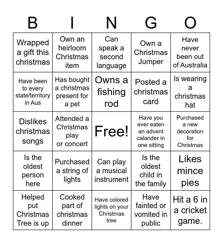 This bingo card has a free space and 29 words: Helped put Christmas Tree is up, Have purchased at least one Christmas gift, Attended a Christmas play or concert, Have lights up on the outside of your home, Wrapped a gift this christmas, Can speak a second language, Has bought a christmas present for a pet, Purchased a string of lights, Have you ever eaten an advent calander in one sitting, Cooked part of christmas dinner, Purchased a new decoration for Christmas, Hit a 6 in a cricket game., Have colored lights on your Christmas tree, Have fainted or vomited in public, Is wearing a christmas hat, Watched a Christmas movie this christmas, Can play a musical instrument, Is the oldest person here, Have never been out of Australia, Dislikes christmas songs, Is the oldest child in the family, Taken a Christmas photo, Posted a christmas card, Have been to every state/territory in Aus, Own a Christmas Jumper, Own an heirloom Christmas item, Likes mince pies, Owns a fishing rod and Made a ginger bread house.